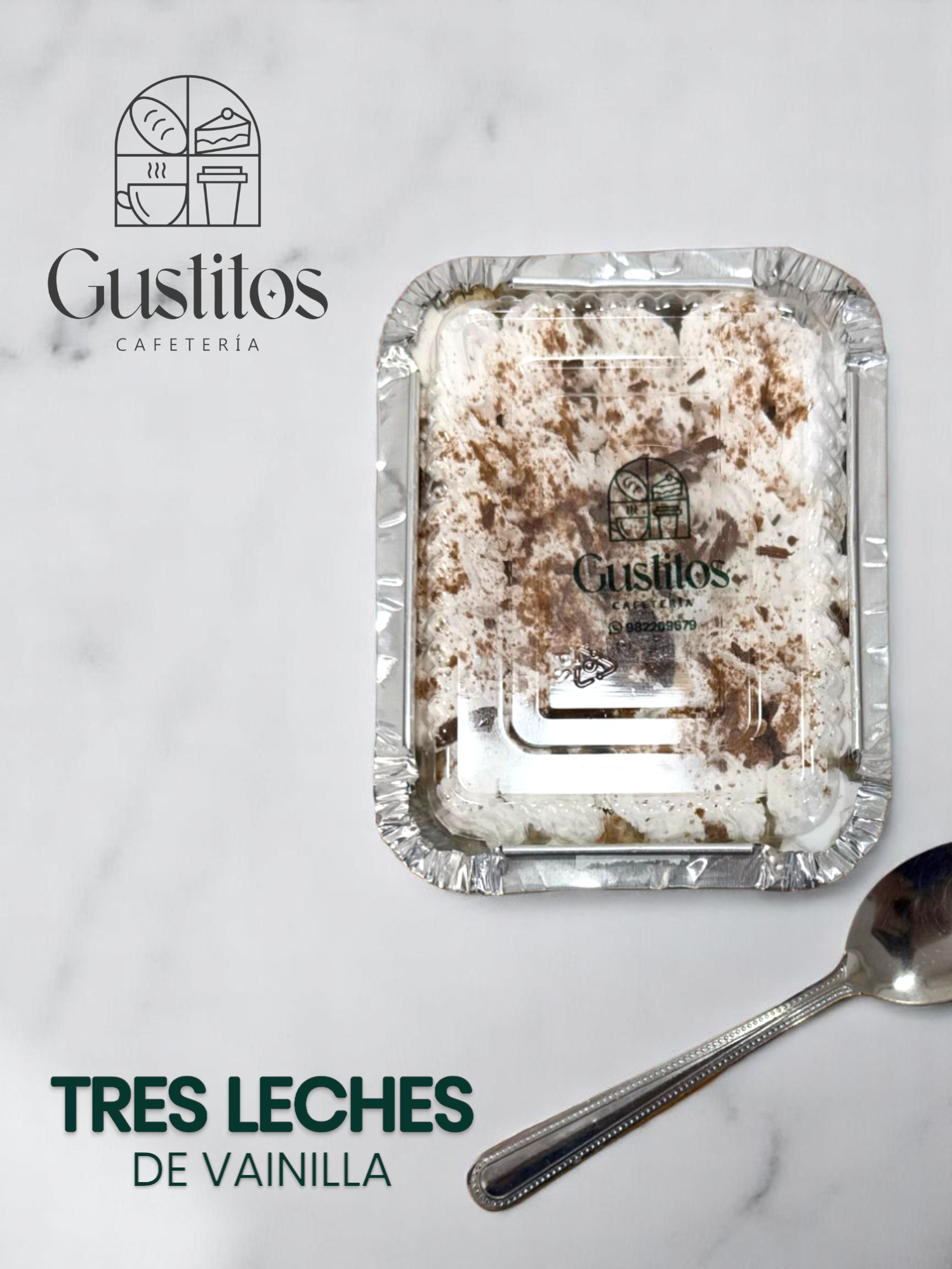 Bizcochuelo de Vainilla empapado con una mezcla de leches relleno y cubierto de chantilly y decorado con canela.